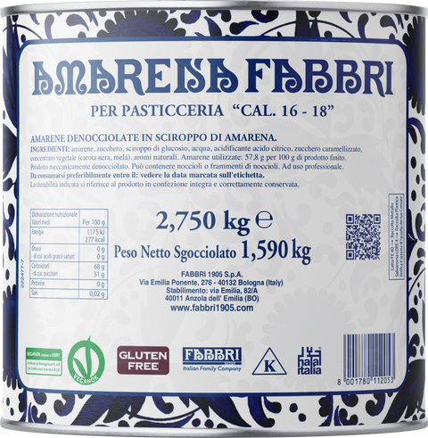 Amarena Fabbri, selezionata e lavorata secondo la ricetta originale del 1915, è un simbolo di tradizione e qualità, ideale per dolci da forno, creazioni di pasticceria e gelateria. Disponibile in 4 calibri: con sciroppo, sgocciolata, intera e in pezzi.